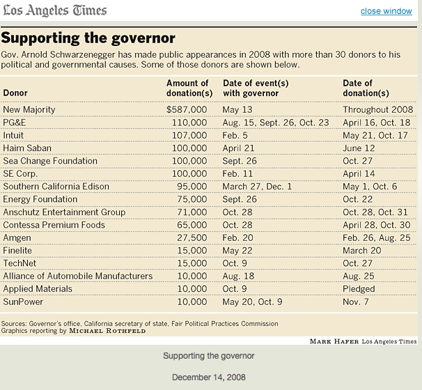 News Archive - Web Logs - Press Releases Dec 16, 2008 - 01:45 PM You Scratch My Back... And I’ll Be Backby Mark RebackMichael Rothfeld of the LA Times recently highlighted Governor Schwarzenegger's many public appearances this year on behalf of his donors. ![]() Rothfeld detailed one of Arnold's main mutual back-scratching arrangements, when in October of this year, Anschutz Entertainment Group completed a two-year project to generate solar power on the Staples Center roof, and our action governor showed up at a ceremony to give green praise to the Staples Center and its owners. We're not supposed to notice that they've given $296,000 to Arnold's various committees over the years... Or that Schwarzenegger returned to the Staples Center that same night at the Lakers' season opener for a fundraiser thrown by the company that raked in half a million dollars for the gov's political endeavors. Alas, doing his donors' bidding is nothing new to Arnold, as we've documented before here, here, and here... Anyone else think that the gov should put more effort into helping to fix the state budget debacle than he does doing favors for his donors? --------------- E-mail comments to ArnoldWatch at arnoldwatch@consumerwatchdog.org |
